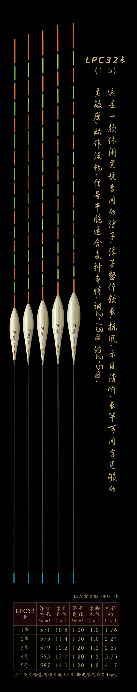 LPC32長:是一款休閑黑坑專用的浮子,浮子整體較長,抗風(fēng),示目清晰,長竿可用有足夠的靈敏度,動(dòng)作流暢,信號(hào)干脆適合多種魚情,調(diào)2—13目,釣2-5目。