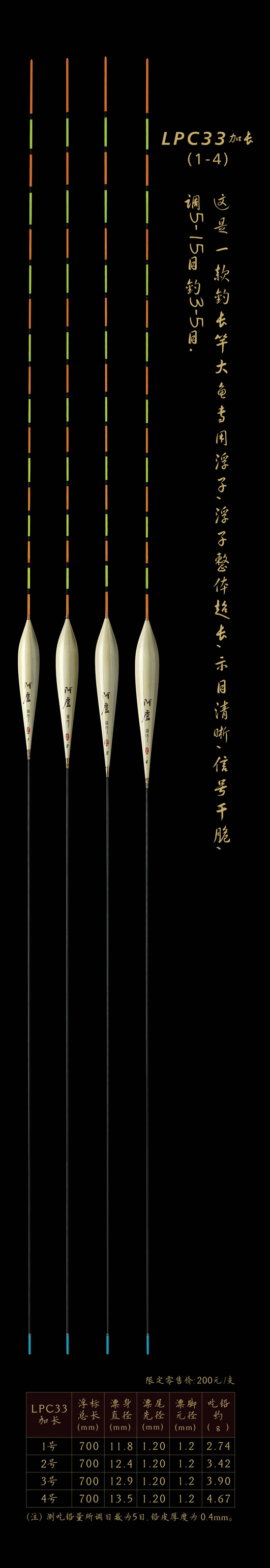 LPC33加長:釣長竿大魚專用浮子,浮子整體超長,示目清晰,信號(hào)干脆,調(diào)5—15目釣3—5目。
